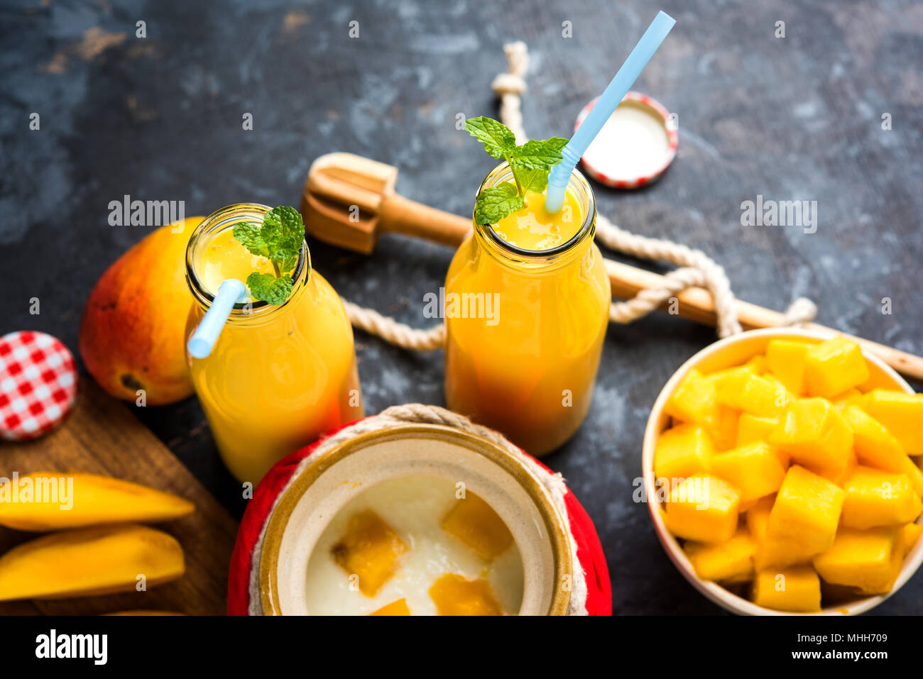 Mango Lassi Or Smoothie In Big Glass Or Small Bottles With Curd Cut Fruit Pieces And Blender Moody Background Selective Focus Stock Photo Alamy